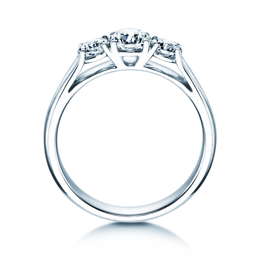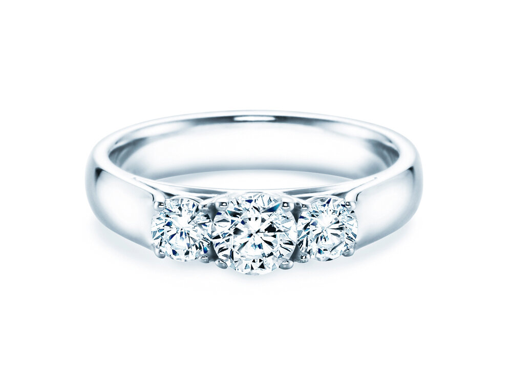 Das Modell 3 Stones präsentiert drei funkelnd leuchtende Diamanten eingebettet in modernem und innovativem Ringdesign. Dieses Design vereint zwei entscheidende Vorteile: 1. Die Diamanten sind offen gefasst und entfalten so ein besonders intensives Leuchten, 2. die sich direkt aus der Ringschiene entwickelnden äußeren Elemente der Fassung schützen die Diamanten und geben ihnen sicheren Halt. Die drei Diamanten symbolisieren drei Zeitebenen – vergangene, jetzige und zukünftige Liebe – und verbinden sich so im Modell 3 Stones zu einem ausdrucksstarken und romantischen Liebesbeweis.