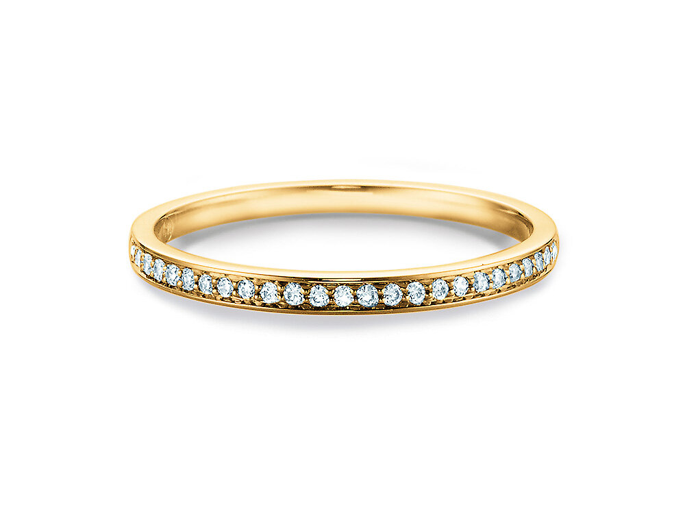 Ein leuchtendes Band aus Diamanten ziert die gesamte obere Hälfte dieses schlichten Alliance-Rings. Mit dem strahlenden Funkeln der Diamanten und seinem zeitlosen Design lässt sich dieser Alliance-Ring perfekt mit anderen Ringen kombinieren.