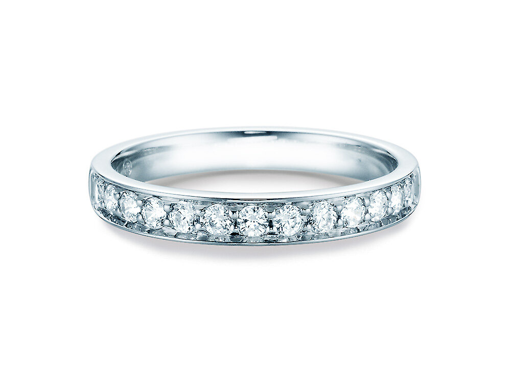Ein leuchtendes Band aus Diamanten ziert die gesamte obere Hälfte dieses schlichten Alliance-Rings. Mit dem strahlenden Funkeln der Diamanten und seinem zeitlosen Design lässt sich dieser Alliance-Ring perfekt mit anderen Ringen kombinieren.