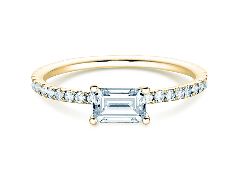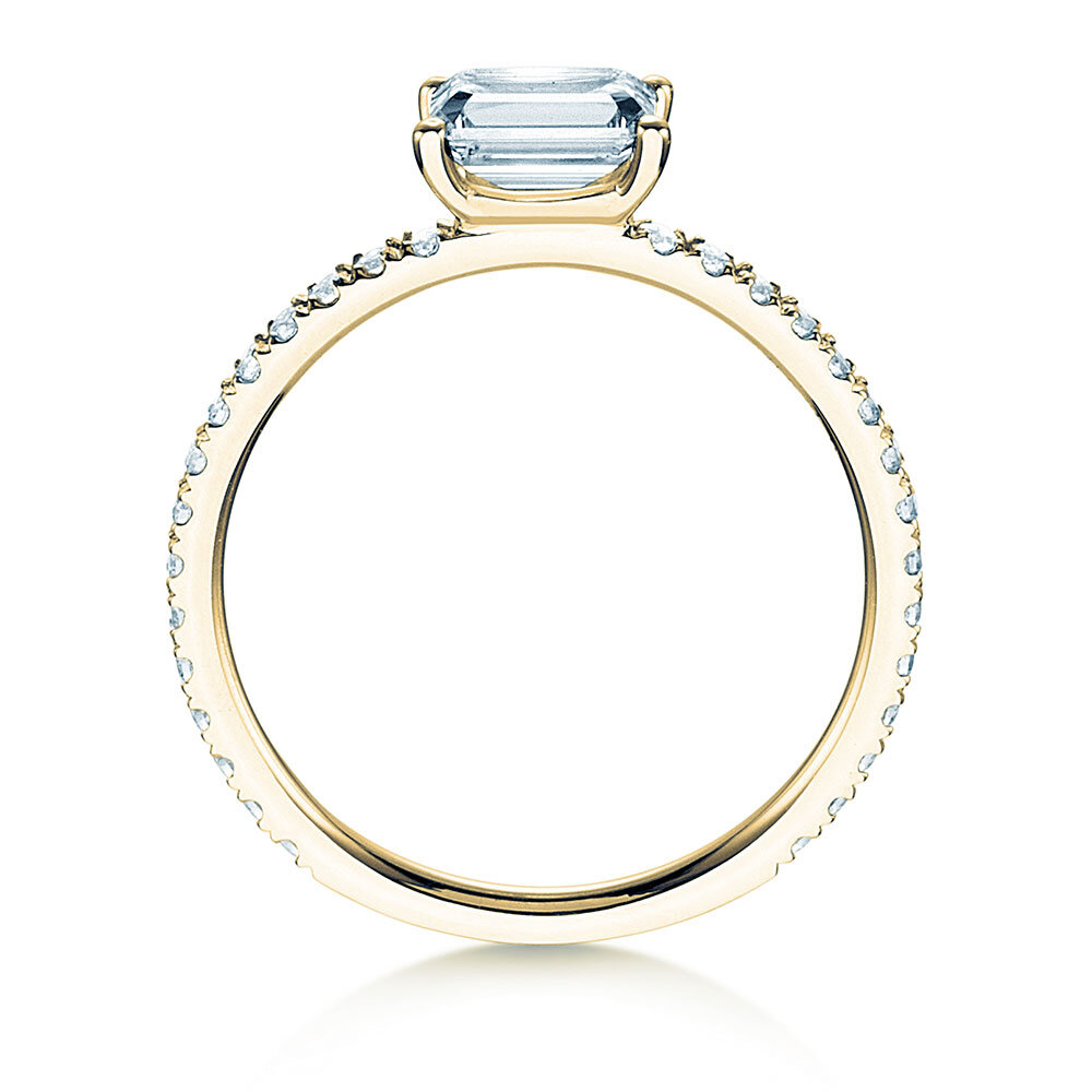 Fein und filigran verarbeitet präsentiert sich der Verlobungsring Emerald Cut. Wählbar in vier Diamantgrößen ab 0,20 Karat. Im präzise geschmiedeten Kanal der Ringschiene sind Pavé-Diamanten mit zusammen 0,24 ct. gefasst.
