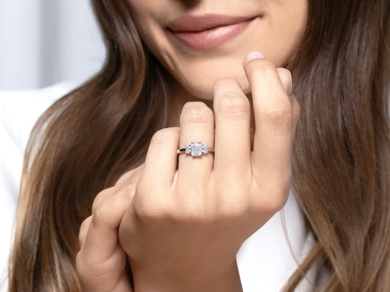 Verlobungsring Emerald Eden: Ein Meisterwerk der Symbolik und Eleganz. Die drei funkelnden Steine stehen für die Vergangenheit, Gegenwart und Zukunft und sind eine Hommage an die ewige Liebe. Der zentrale Emerald-Cut-Stein wird von zwei seitlichen Steinen flankiert, die auf einer zarten Ringschiene aus warmem Roségold thronen. Zeitlos und bedeutungsvoll – ein Ring, der Geschichte schreibt.