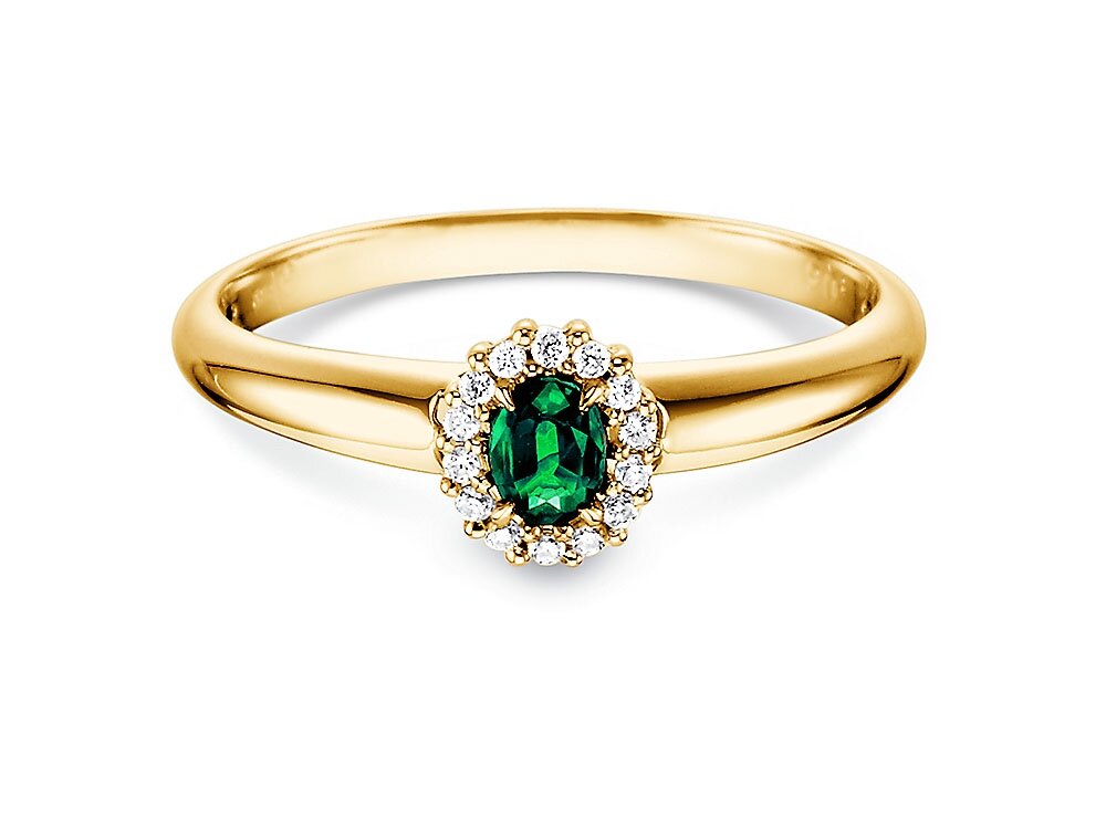 Verlobungsring Jolie mit Saphir 0,25 ct. und Diamanten mit insges. 0,06 ct. Der blaue Saphir wird umrahmt von einem Kranz funkelnder Diamanten. Der beruhigende, blaue Farbton des Saphir steht für eine milde, entspannte und harmonische Atmosphäre – alles Eigenschaften, die man sich auch für die eigene Ehe wünscht.
