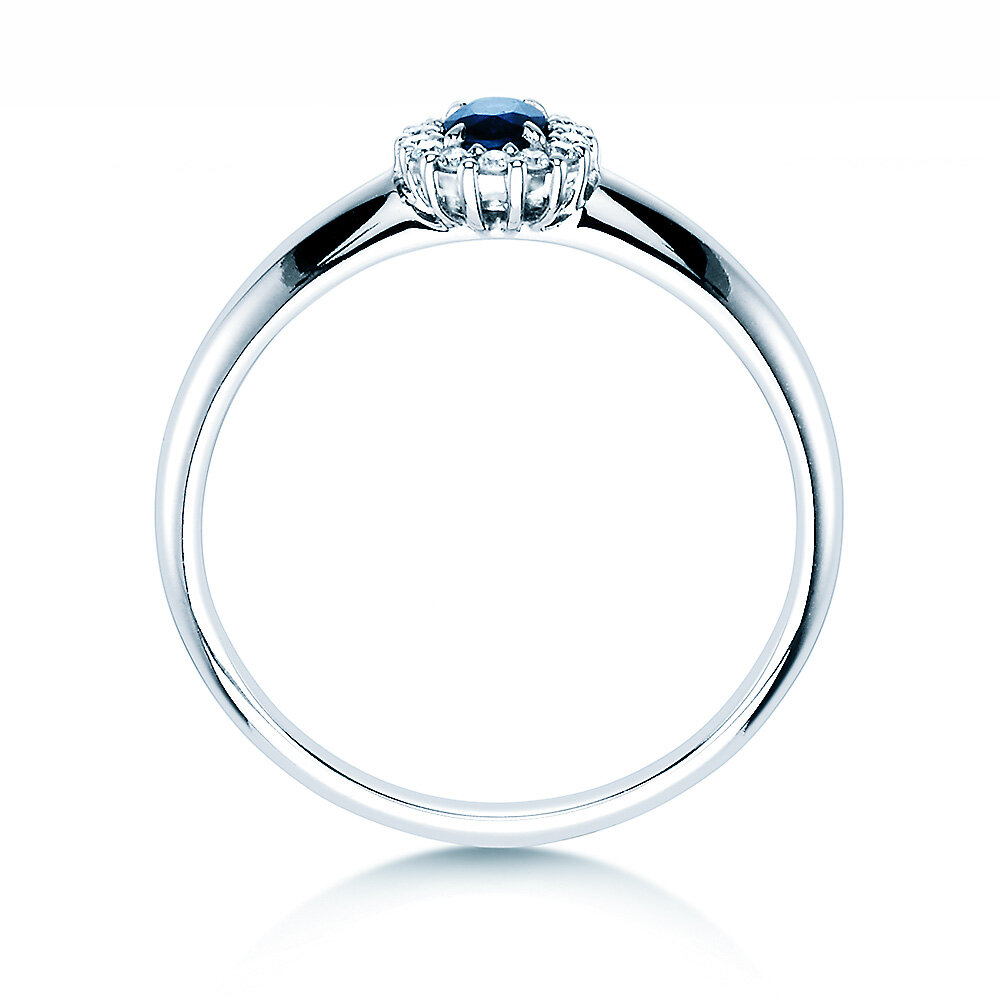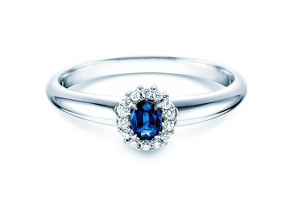 Verlobungsring Jolie mit Saphir 0,25 ct. und Diamanten mit insges. 0,06 ct. Der blaue Saphir wird umrahmt von einem Kranz funkelnder Diamanten. Der beruhigende, blaue Farbton des Saphir steht für eine milde, entspannte und harmonische Atmosphäre – alles Eigenschaften, die man sich auch für die eigene Ehe wünscht.