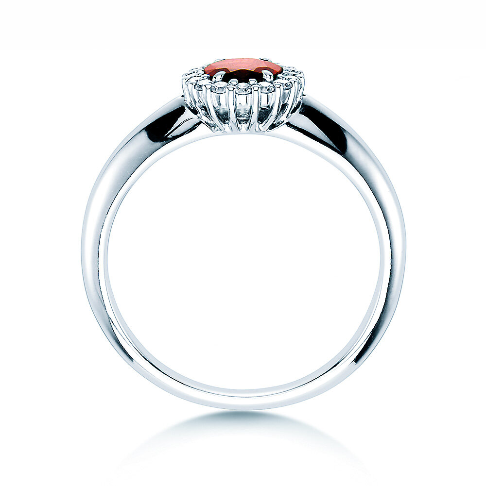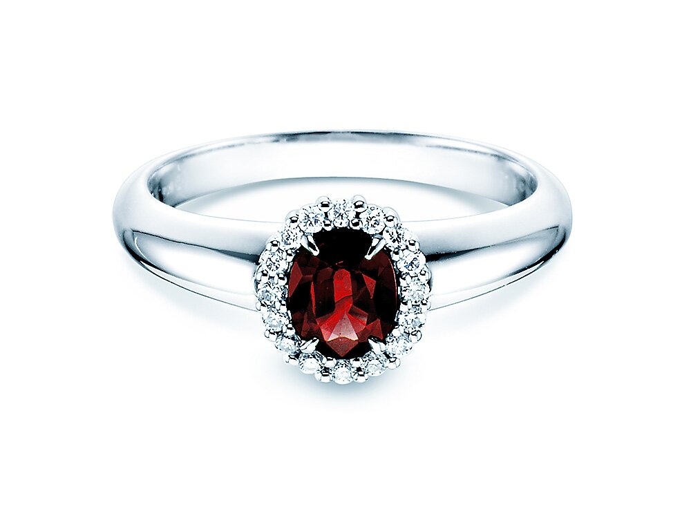 Ein ausgewogener und formschöner Rubinring in Weißgold aus der Modellreihe Windsor. Der oval geschliffene blutrote Rubin wird eingefasst von 16 funkelnden Diamanten. Ein edles Meisterwerk der Goldschmiedekunst und ein zeitloser Klassiker – wertig und anmutig zugleich.