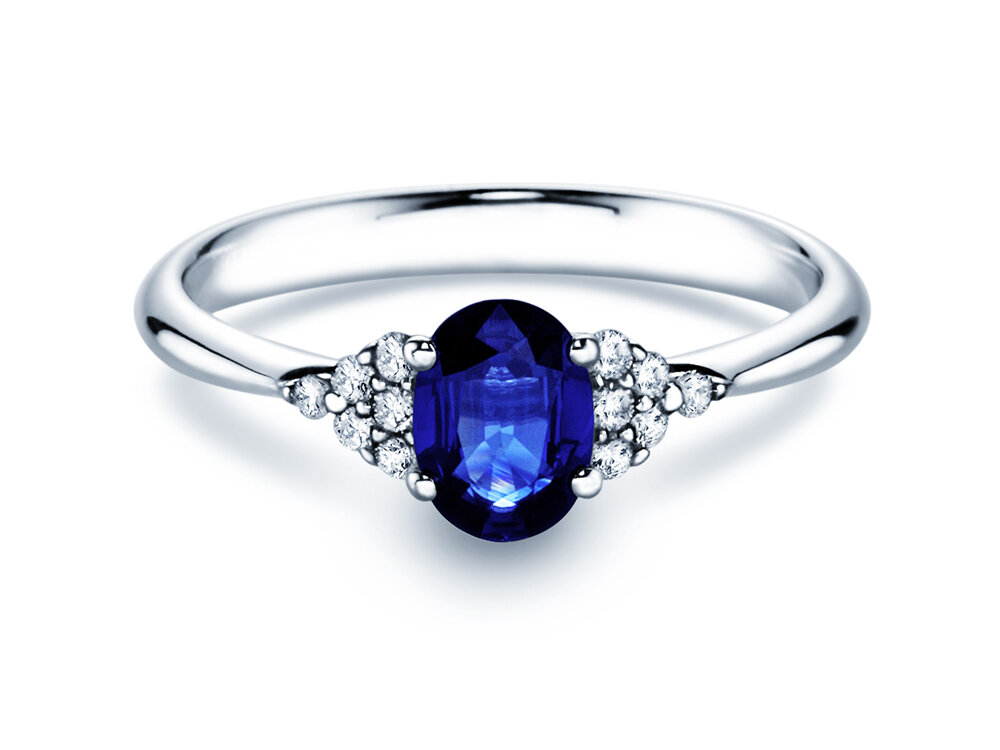 Ein extravaganter Verlobungsring mit Farbedelstein und Diamanten, der sich bestens als Antragsring eignet. Die Seitensteine betonen den intensiv leuchtenden Hauptstein – sechs funkelnden Diamanten auf jeder Seite geben edlen Kleinod eine individuelle Note.