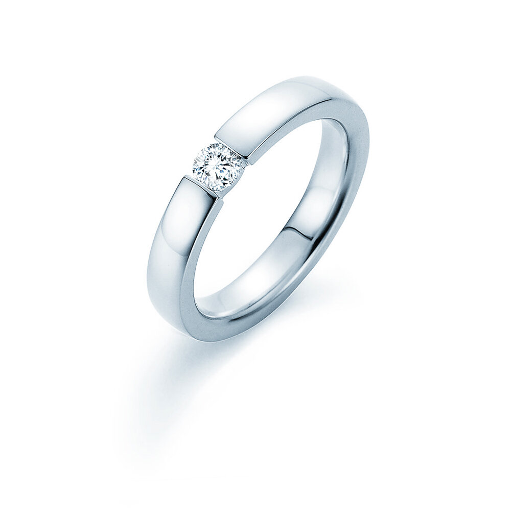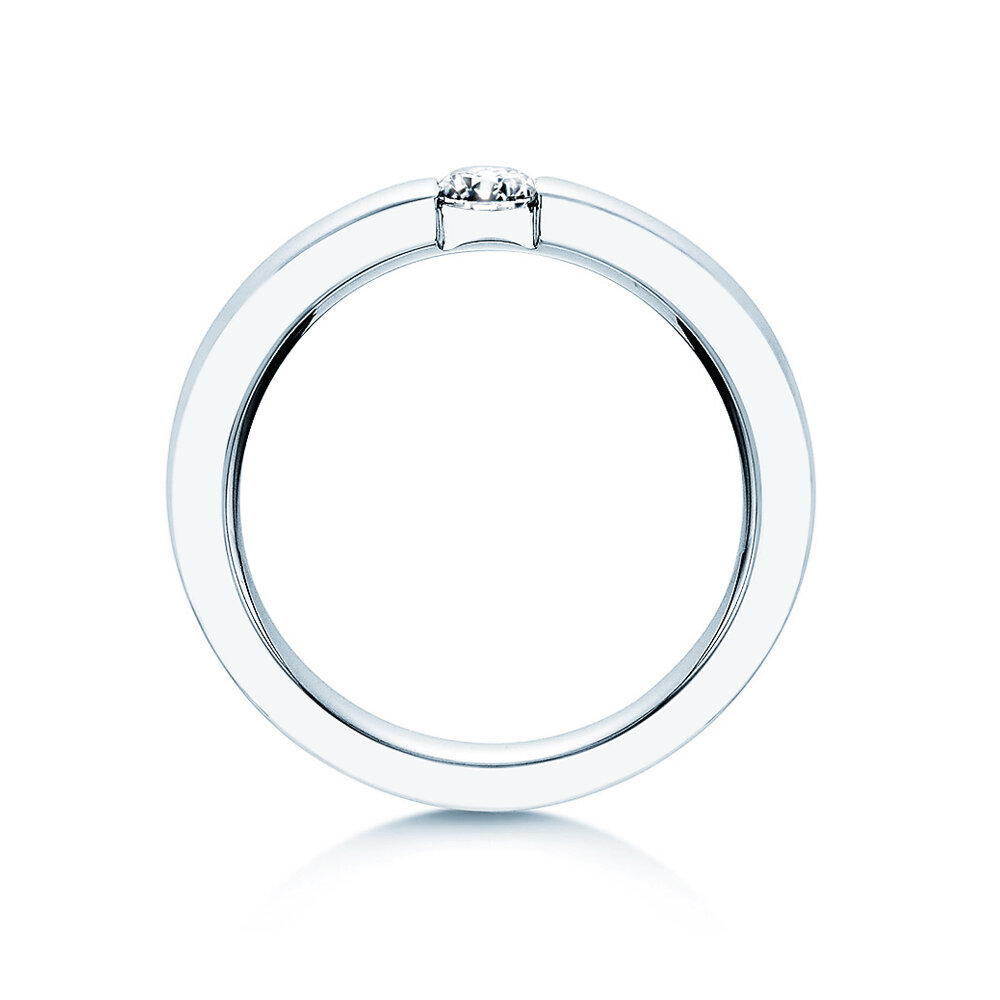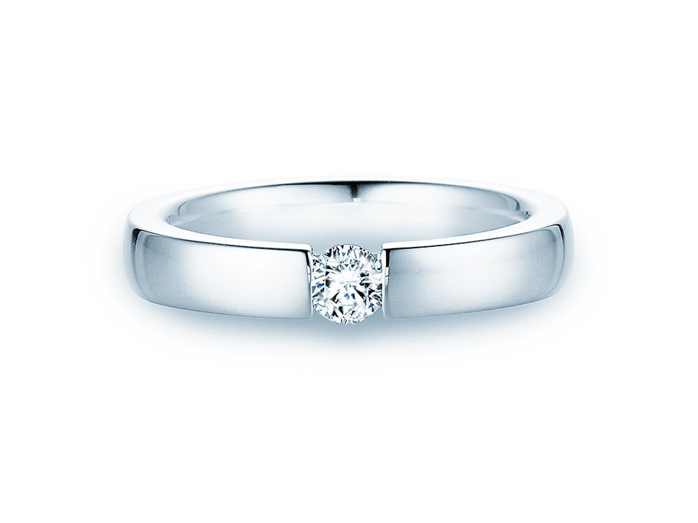 Der modern und schlicht gestaltete Spannring Infinity mit Labordiamant eignet sich hervorragend als Verlobungsring. Der in die Ringschiene eingefasste Labordiamant lässt diesen Verlobungsring ausgewogen und harmonisch wirken; der Labordiamant ist besonders gut gegen mechanische Belastungen geschützt. Als Edelmetall wird am häufigsten Weißgold gewählt.