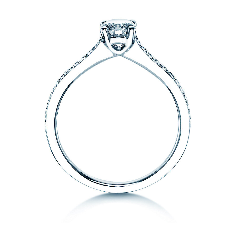 Ein mit runden Brillanten besetztes Band lässt den Diamanten in der klassischen Vierer-Krappen-Fassung auf spektakuläre Weise in weißem Licht erstrahlen. Ein Ring von bezaubernder Schönheit und Stil.
