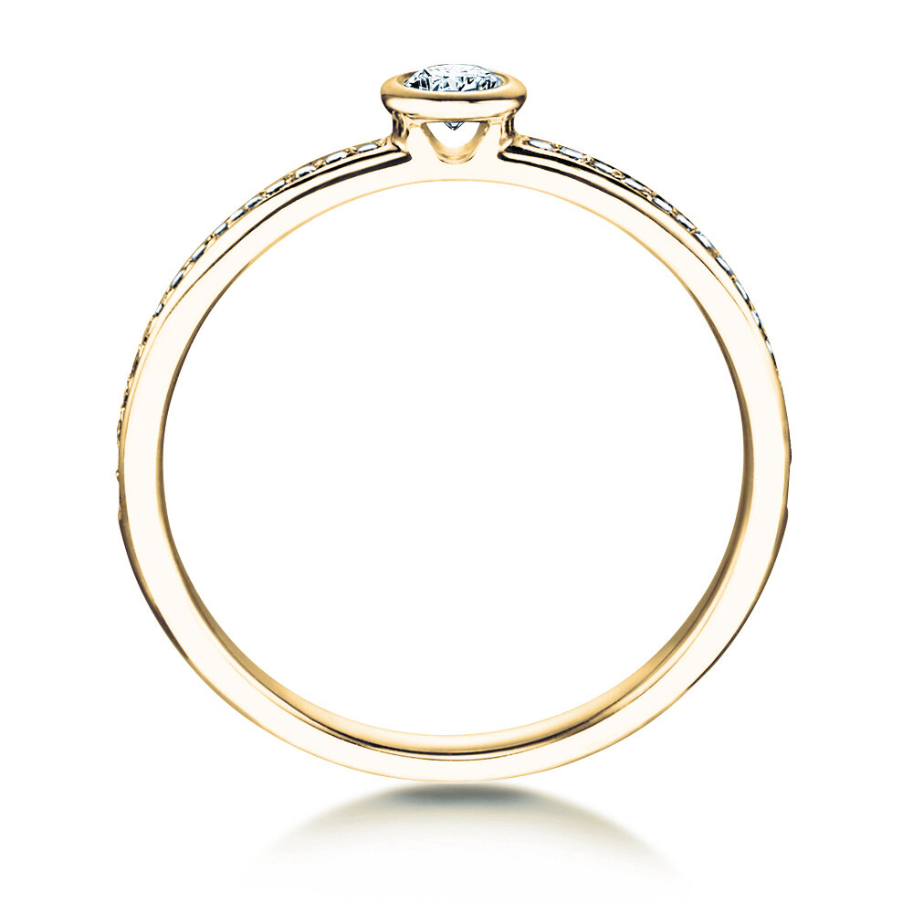 Das schlicht gearbeitete Modell präsentiert sich besetzt mit einer dicht gefassten Reihe hell leuchtender Diamanten. Das strahlend leuchtende Feuer dieser Kostbarkeiten wird sanft gebändigt von der schmal laufenden, glänzend polierten Ringschiene, die auf der Innenseite anschmiegsam gerundet ist. Der strahlend funkelnde Hauptstein wird sicher umschlossen von einer schlichten und zeitlosen Zargenfassung.