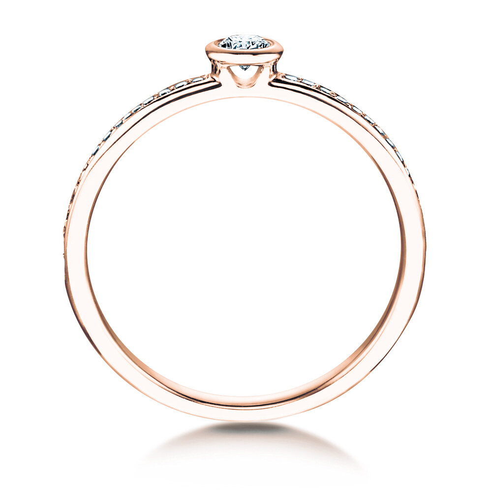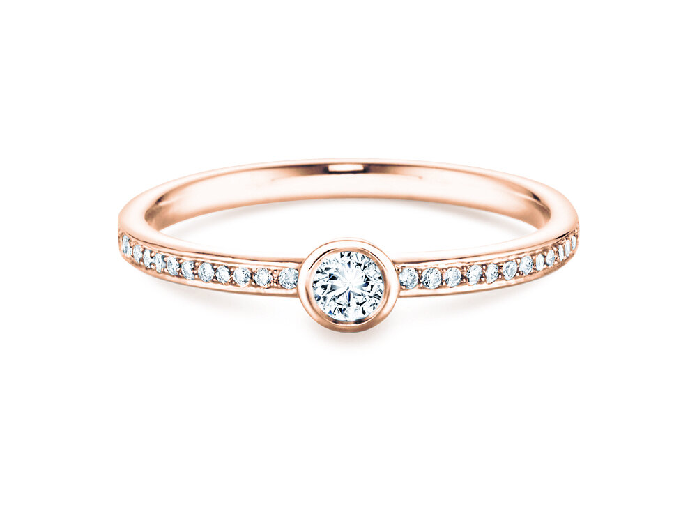 Das schlicht gearbeitete Modell präsentiert sich besetzt mit einer dicht gefassten Reihe hell leuchtender Diamanten. Das strahlend leuchtende Feuer dieser Kostbarkeiten wird sanft gebändigt von der schmal laufenden, glänzend polierten Ringschiene, die auf der Innenseite anschmiegsam gerundet ist. Der strahlend funkelnde Hauptstein wird sicher umschlossen von einer schlichten und zeitlosen Zargenfassung.