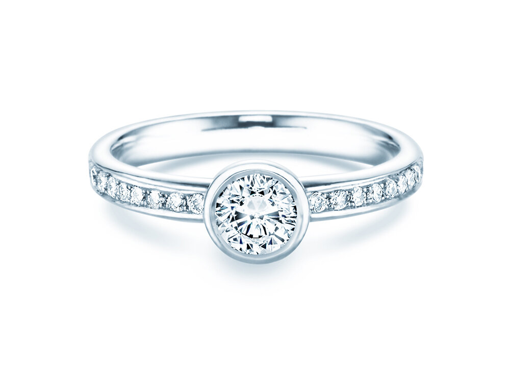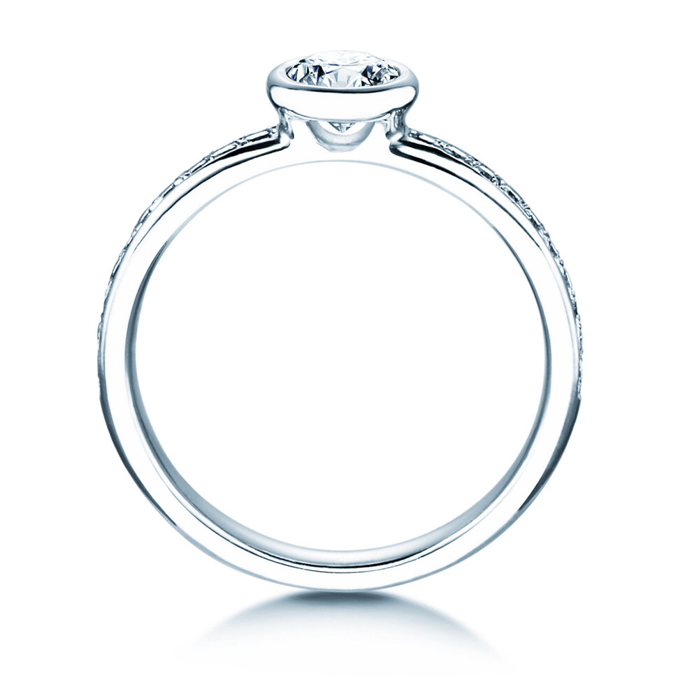 Das schlicht gearbeitete Modell präsentiert sich besetzt mit einer dicht gefassten Reihe hell leuchtender Diamanten. Das strahlend leuchtende Feuer dieser Kostbarkeiten wird sanft gebändigt von der schmal laufenden, glänzend polierten Ringschiene, die auf der Innenseite anschmiegsam gerundet ist. Der strahlend funkelnde Hauptstein wird sicher umschlossen von einer schlichten und zeitlosen Zargenfassung.