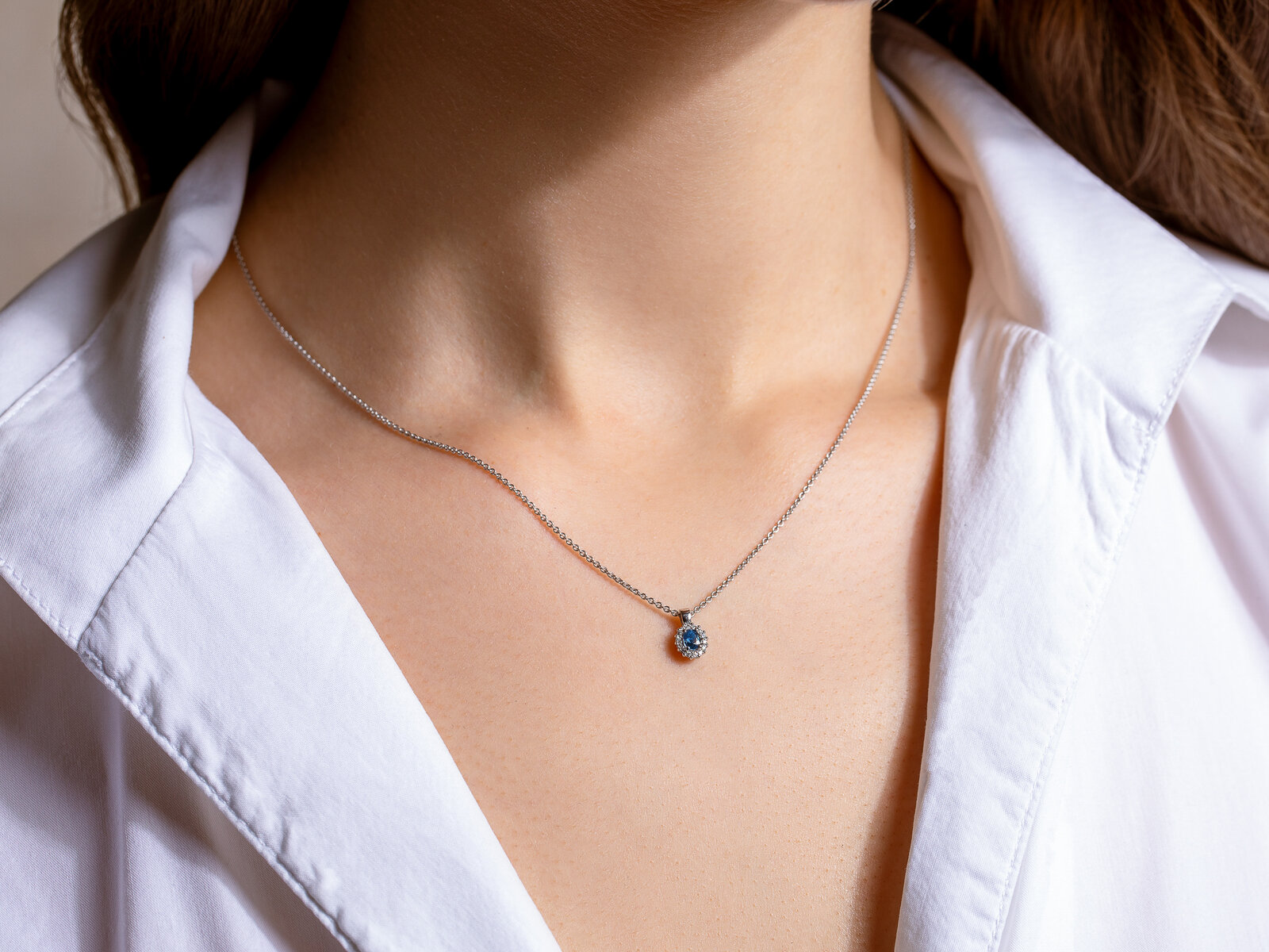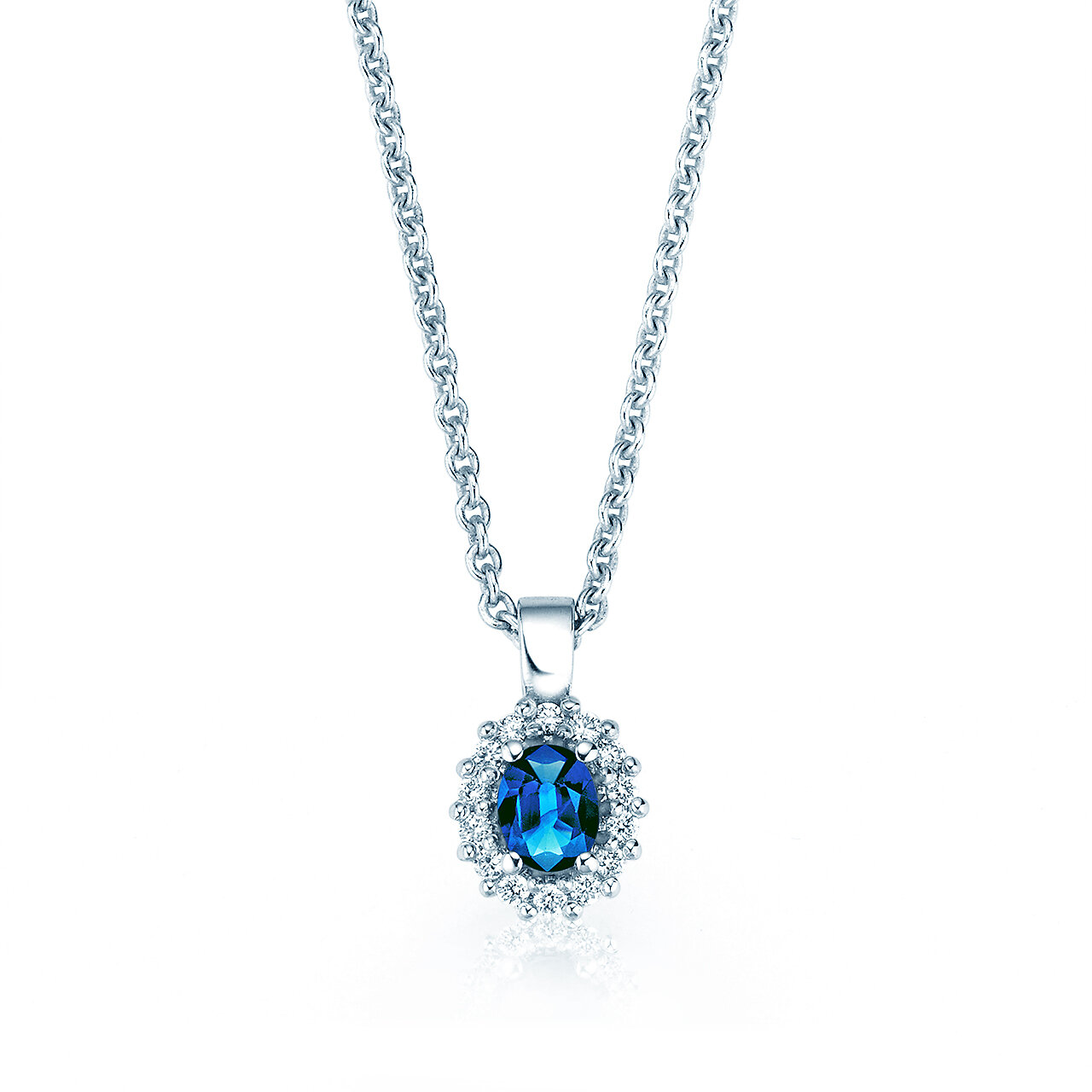 Der beliebte Anhänger Jolie ist mit Saphir, Smaragd oder Rubin erhältlich und verziert mit einem Kranz hell funkelnder Diamanten.