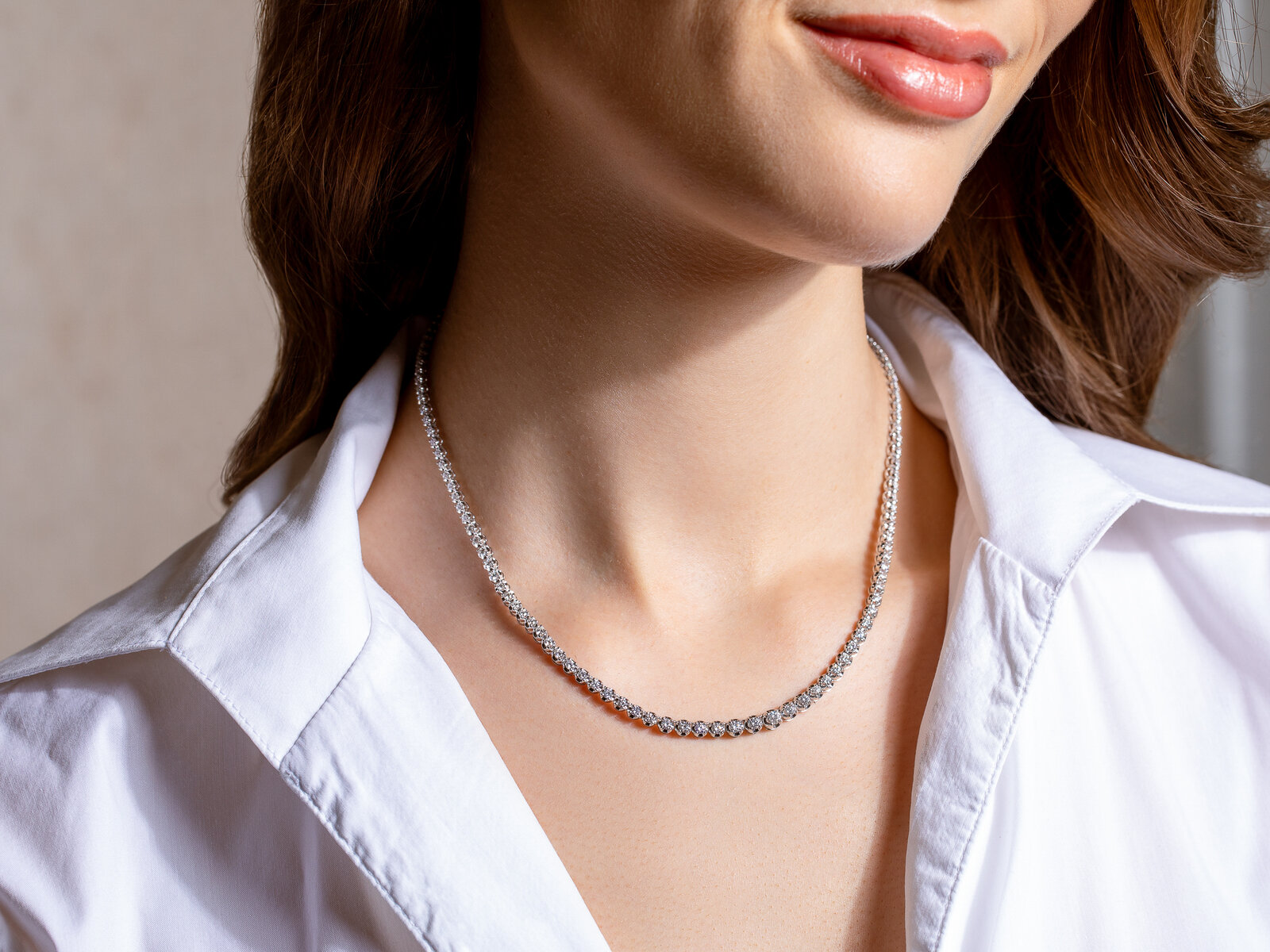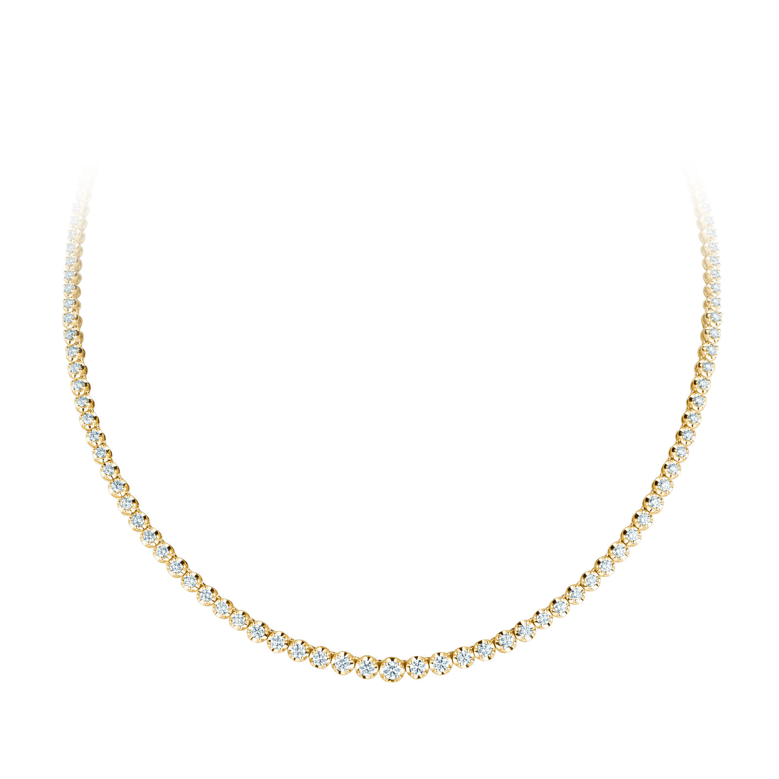 Das klassische Tennis-Collier ist komplett mit Diamanten gefasst, die zur Mitte hin größer werden.