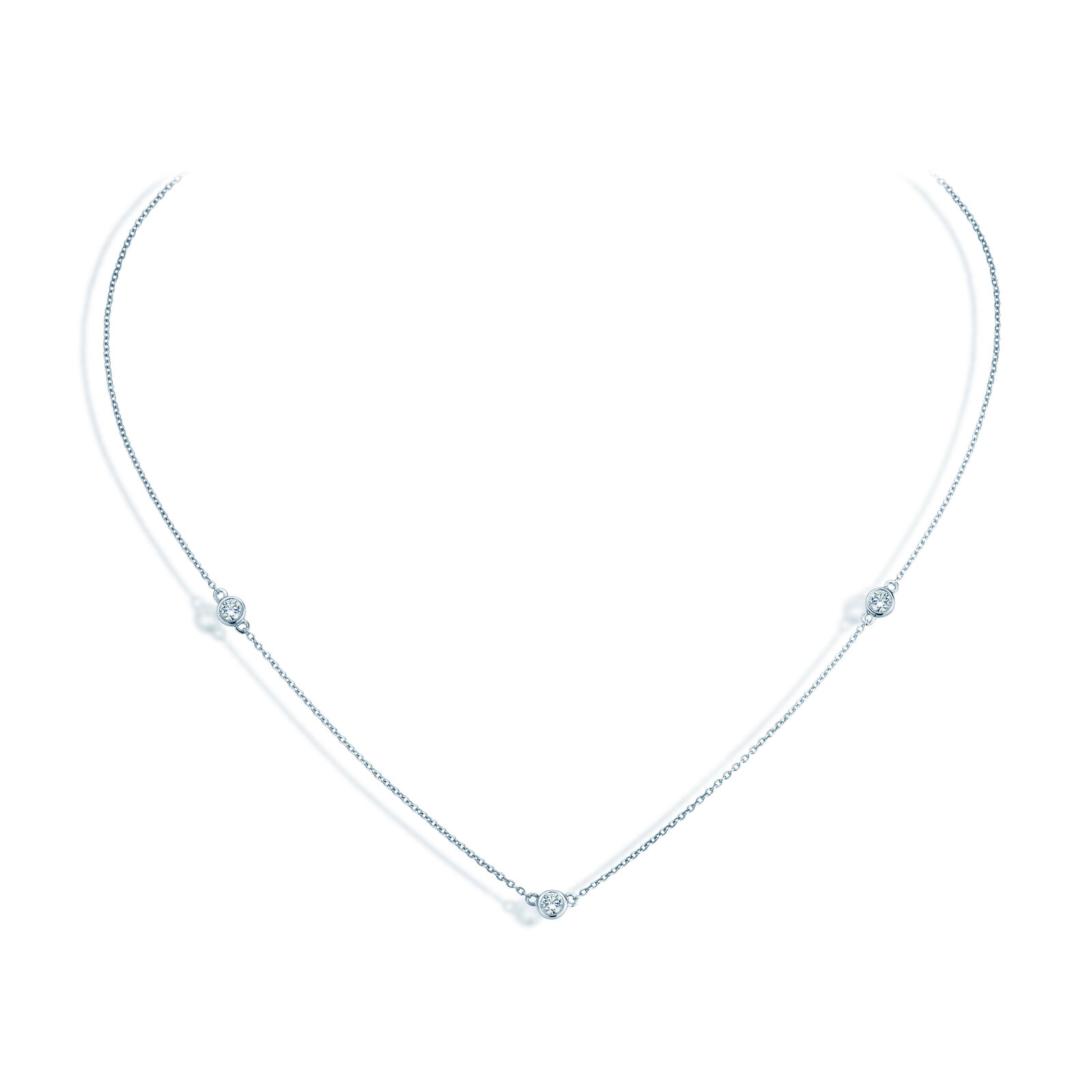 Zur Auswahl stehen Ketten mit einem, drei oder fünf Diamanten. Die Ketten sind in fünf Diamantgrößen und aus Weißgold, Gelbgold oder Roségold erhältlich.