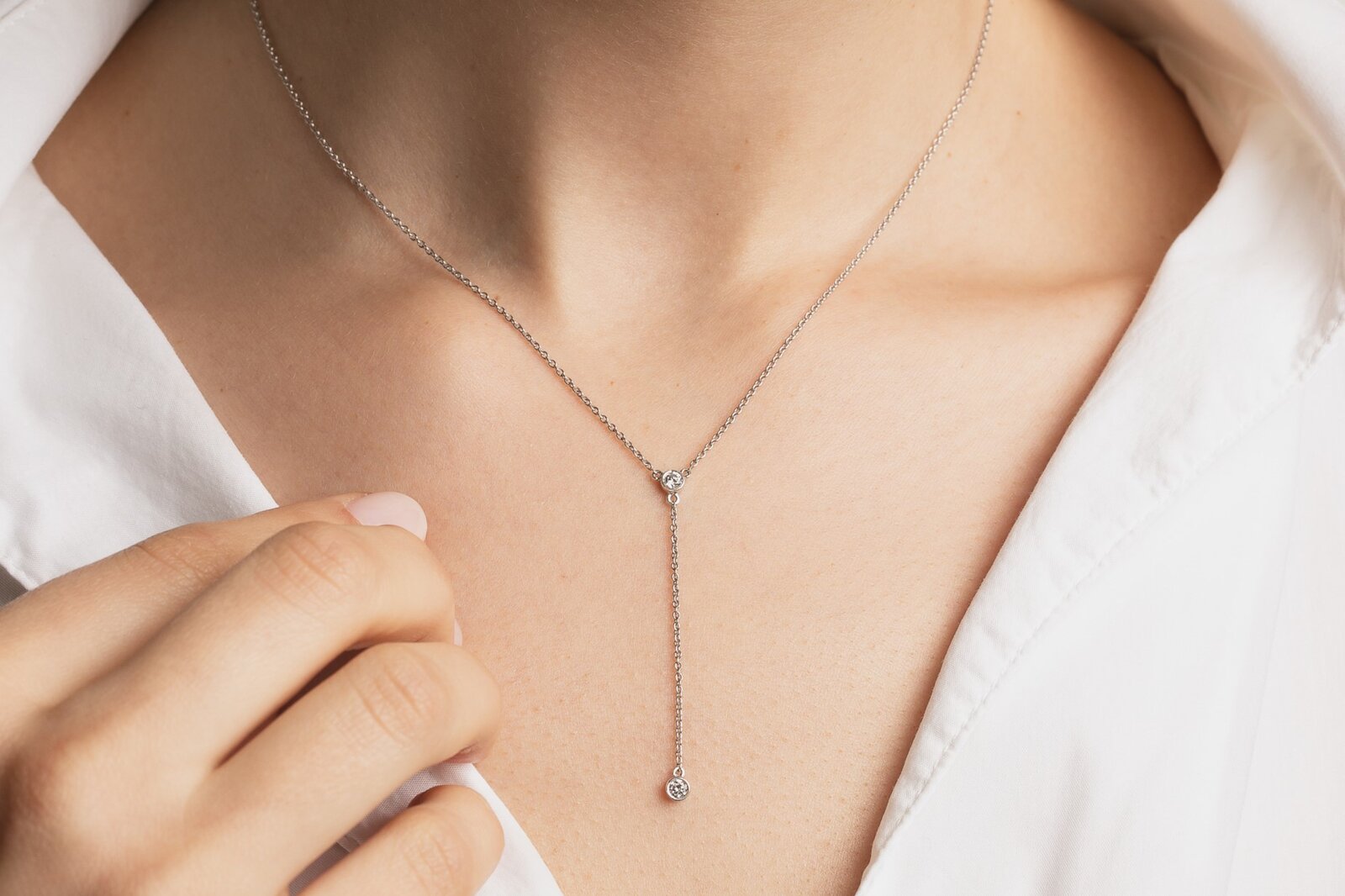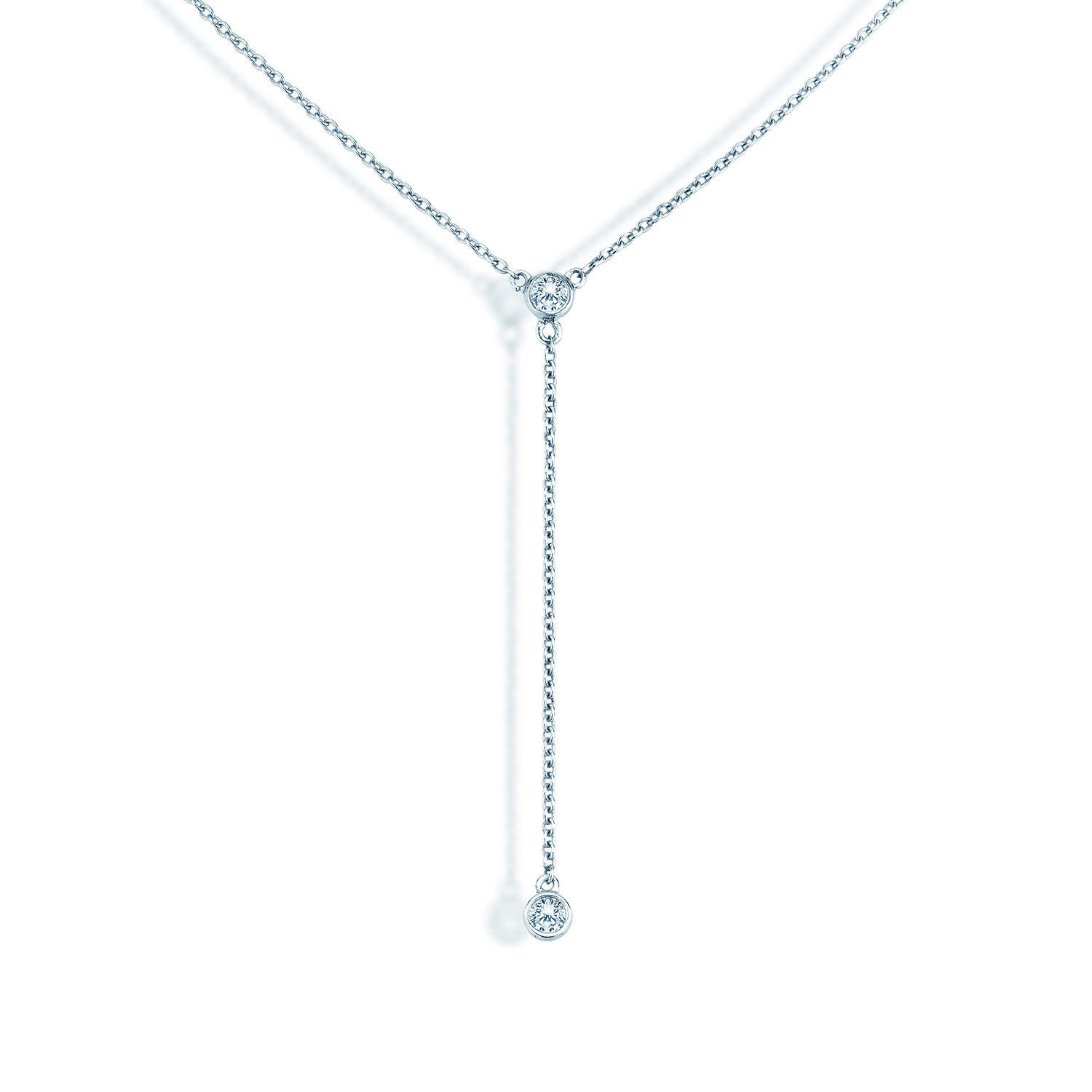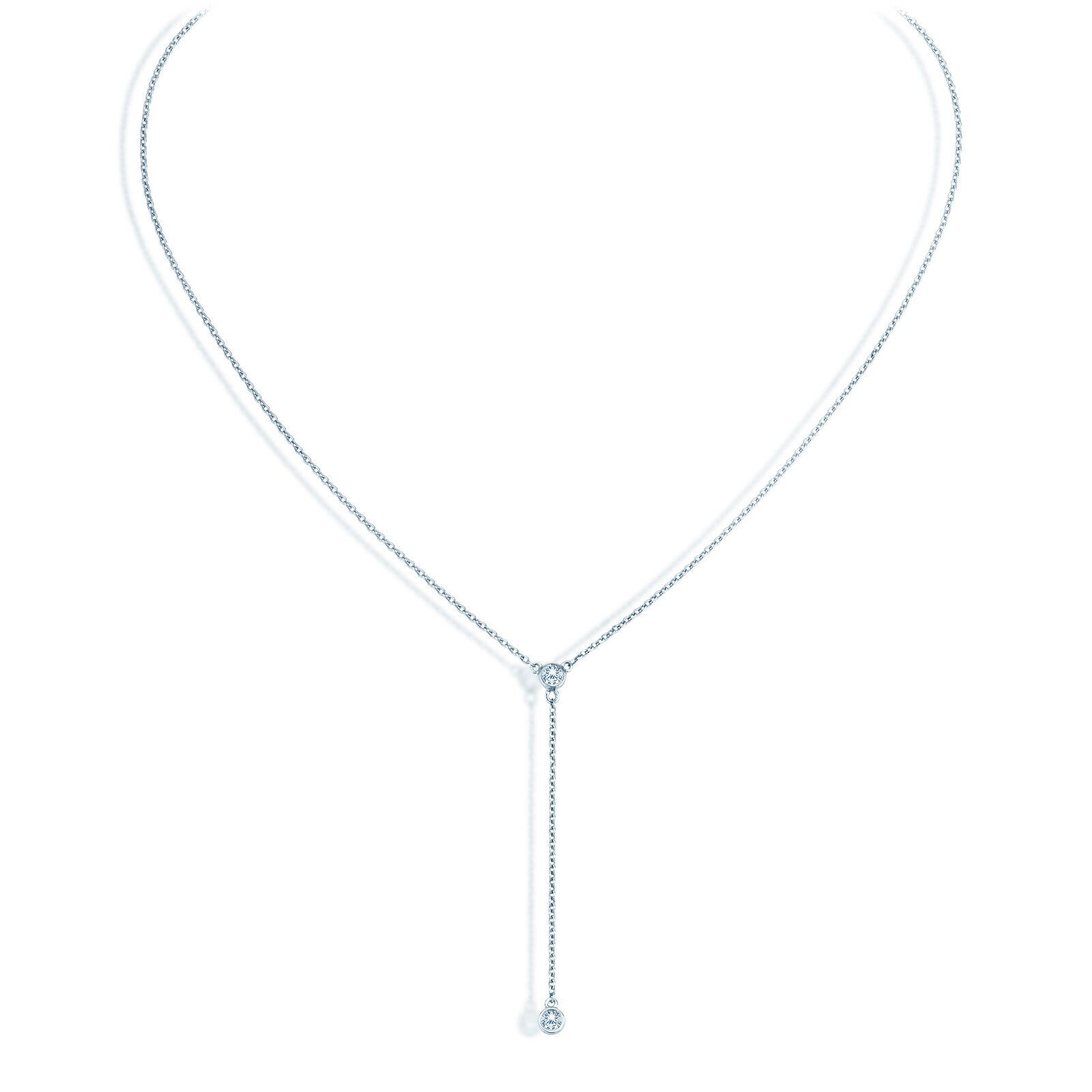 Der Halsschmuck verzaubert mit zarter Eleganz und zwei Diamanten. Der obere der beiden runden Edelsteine verbindet als zentrales Element Halskette und Anhänger.