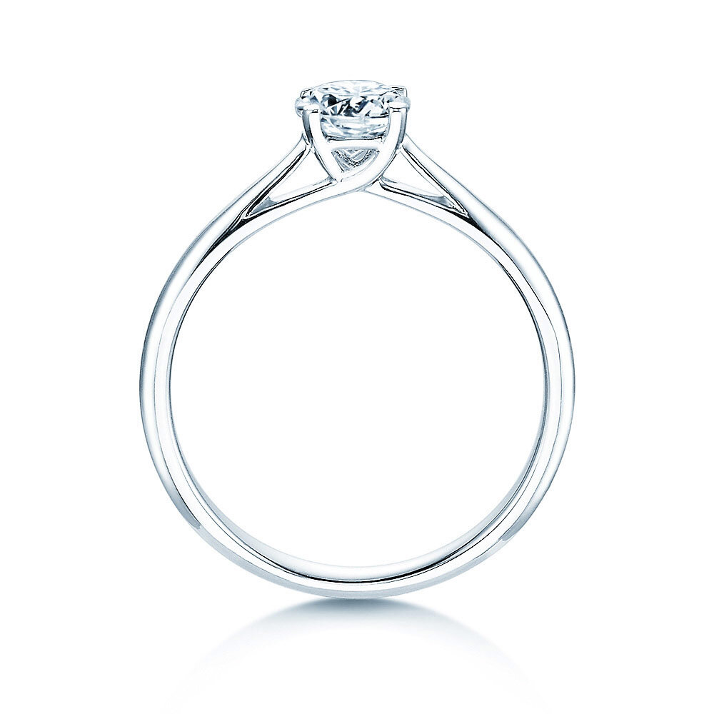 Eine kunstvoll gestaltete Fassung hebt den Diamanten elegant über die schlicht gearbeitete Ringschiene hinaus. So wird das Maximum des einfallenden Lichts reflektiert und der Diamant kann sein magisches Funkeln optimal entfalten. Der Auftritt dieses Rings ist angenehm zurückhaltend und zugleich stilvoll und trendy.