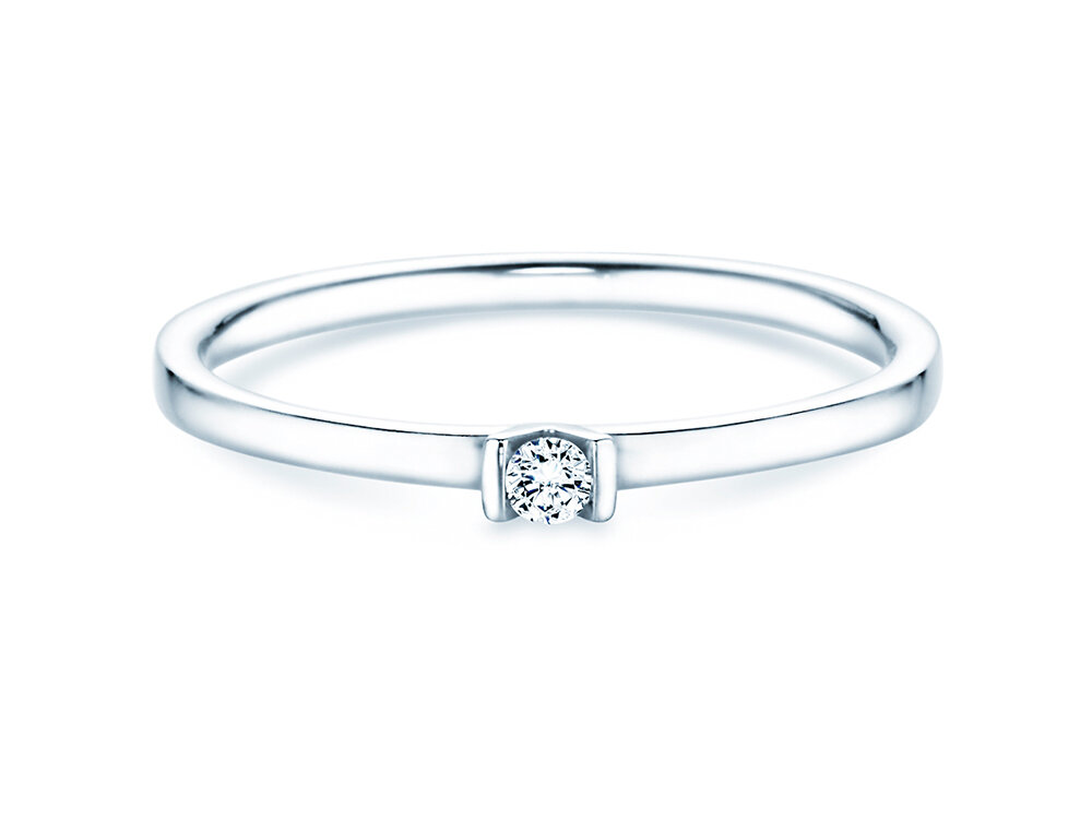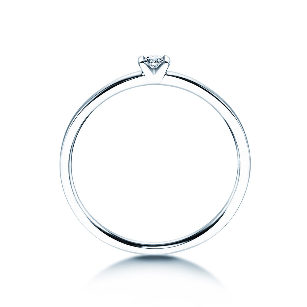 Die zurückhaltend geformte Ringschiene schließt sich in einer V-förmig gearbeiteten Fassung. Klar gestaltet hält sie den funkelnd hellen Diamanten. Durch die offenen Seiten erhält der Diamant viel Licht und kann so seine Brillanz voll entfalten.