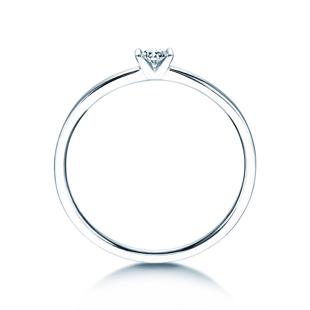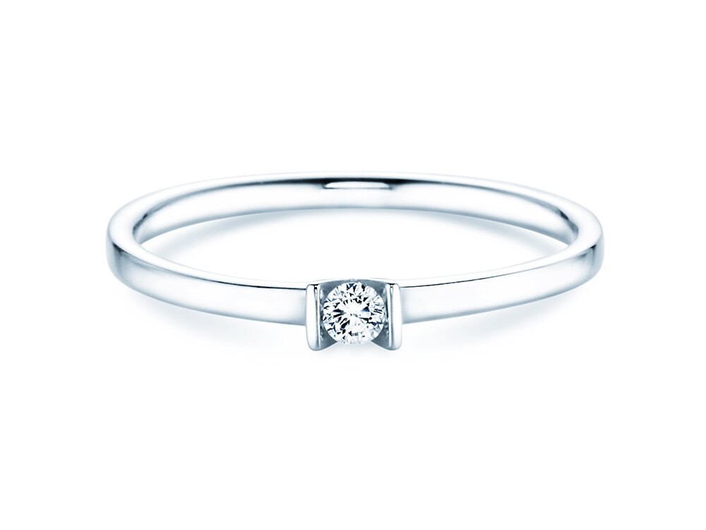 Die zurückhaltend geformte Ringschiene schließt sich in einer V-förmig gearbeiteten Fassung. Klar gestaltet hält sie den funkelnd hellen Diamanten. Durch die offenen Seiten erhält der Diamant viel Licht und kann so seine Brillanz voll entfalten.