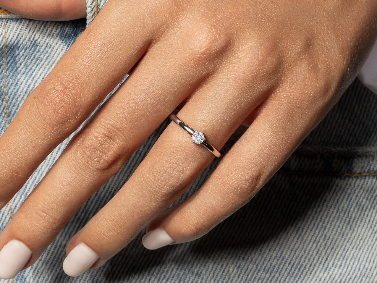• Klassischer Verlobungsring mit harmonisch gerahmtem Diamanten
