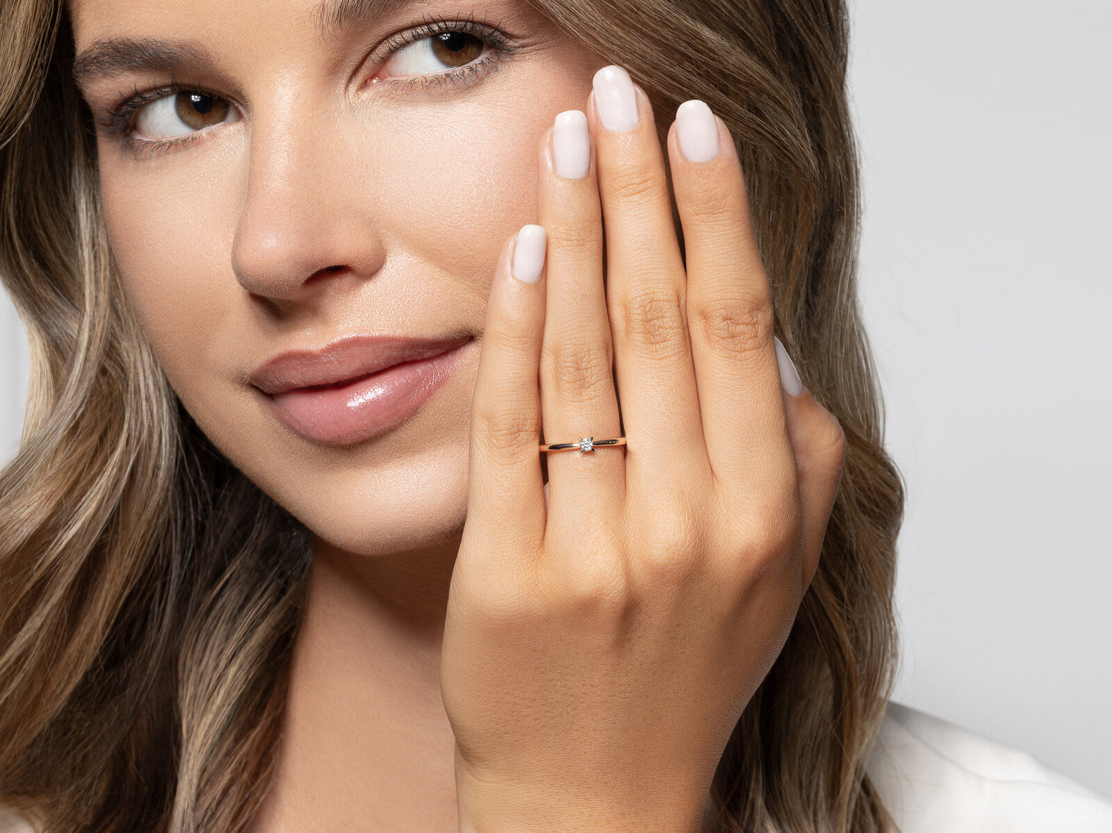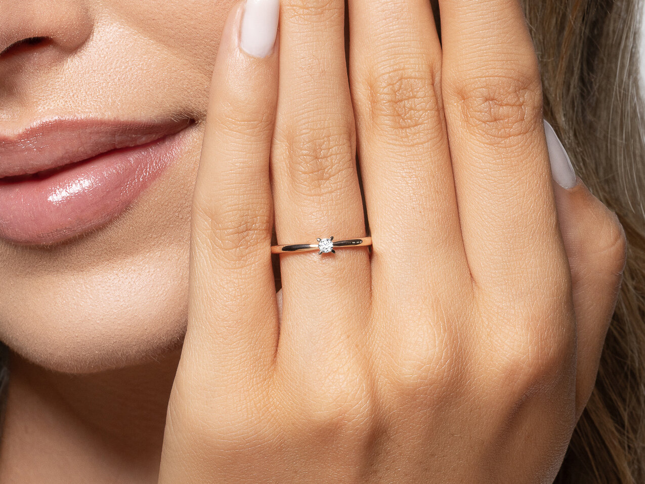 Verlobungsring Modern Petite mit echtem Diamant und vierer Krappenfassung. Durch die dezente Fassung des Solitärring Modern Petite kann sich das Licht im Diamanten exzellent brechen.