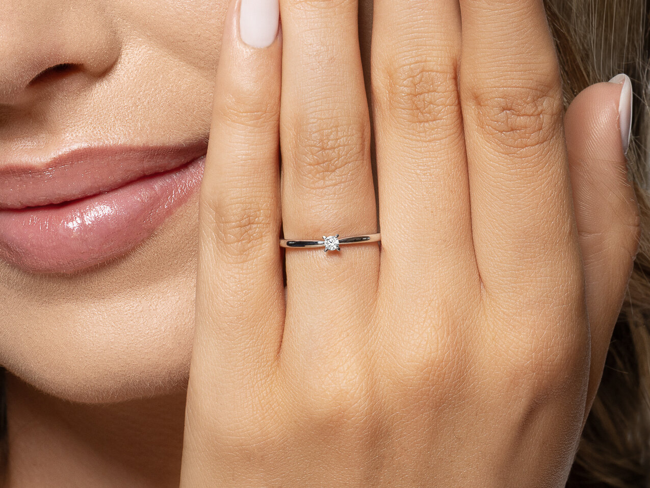 Verlobungsring Modern Petite mit echtem Diamant und vierer Krappenfassung. Durch die dezente Fassung des Solitärring Modern Petite kann sich das Licht im Diamanten exzellent brechen.