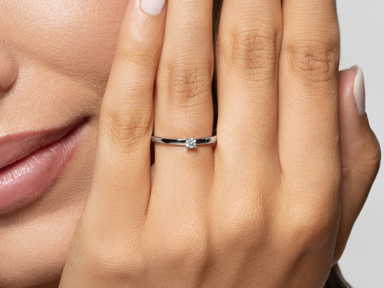 Verlobungsring Modern Petite mit echtem Diamant und vierer Krappenfassung. Durch die dezente Fassung des Solitärring Modern Petite kann sich das Licht im Diamanten exzellent brechen.