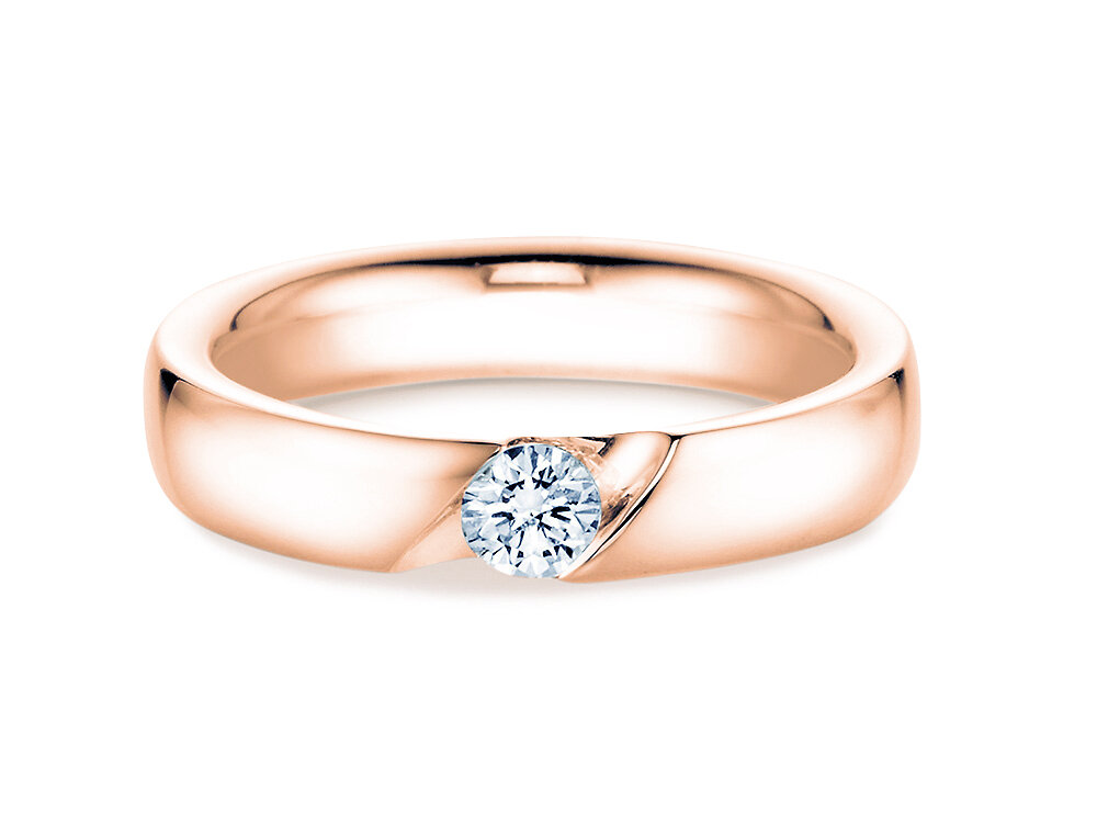 Ein klassischer Spannring, schlicht und elegant. Auf den zweiten Blick offenbart sich seine besondere Raffinesse, die diagonal verlaufende Fassung. Sie gibt dem Diamanten sicheren Halt und sorgt, durch die offen ausgeformten Seiten, für seitlich einfallendes Licht. Der Diamanten beginnt zu strahlen.