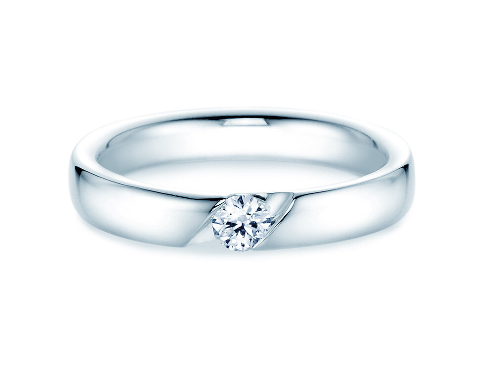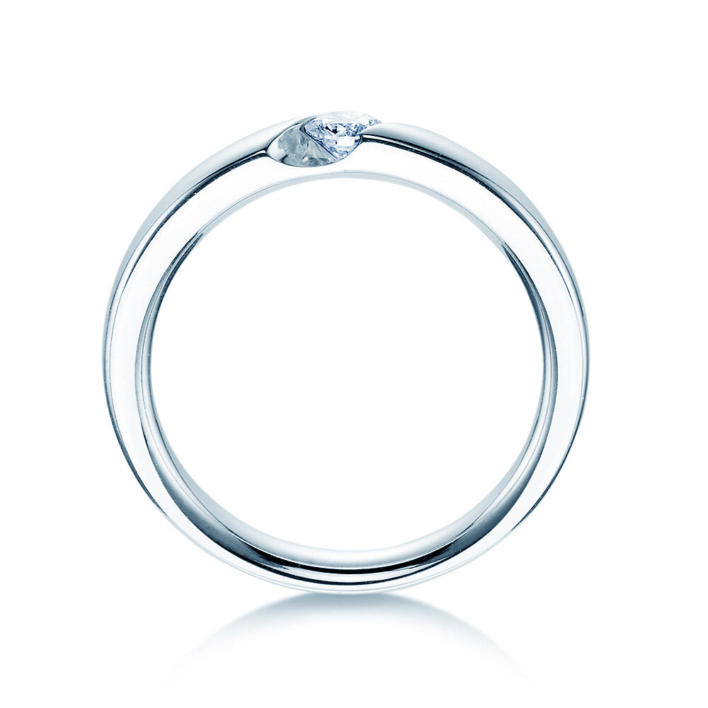 Ein klassischer Spannring, schlicht und elegant. Auf den zweiten Blick offenbart sich seine besondere Raffinesse, die diagonal verlaufende Fassung. Sie gibt dem Diamanten sicheren Halt und sorgt, durch die offen ausgeformten Seiten, für seitlich einfallendes Licht. Der Diamanten beginnt zu strahlen.