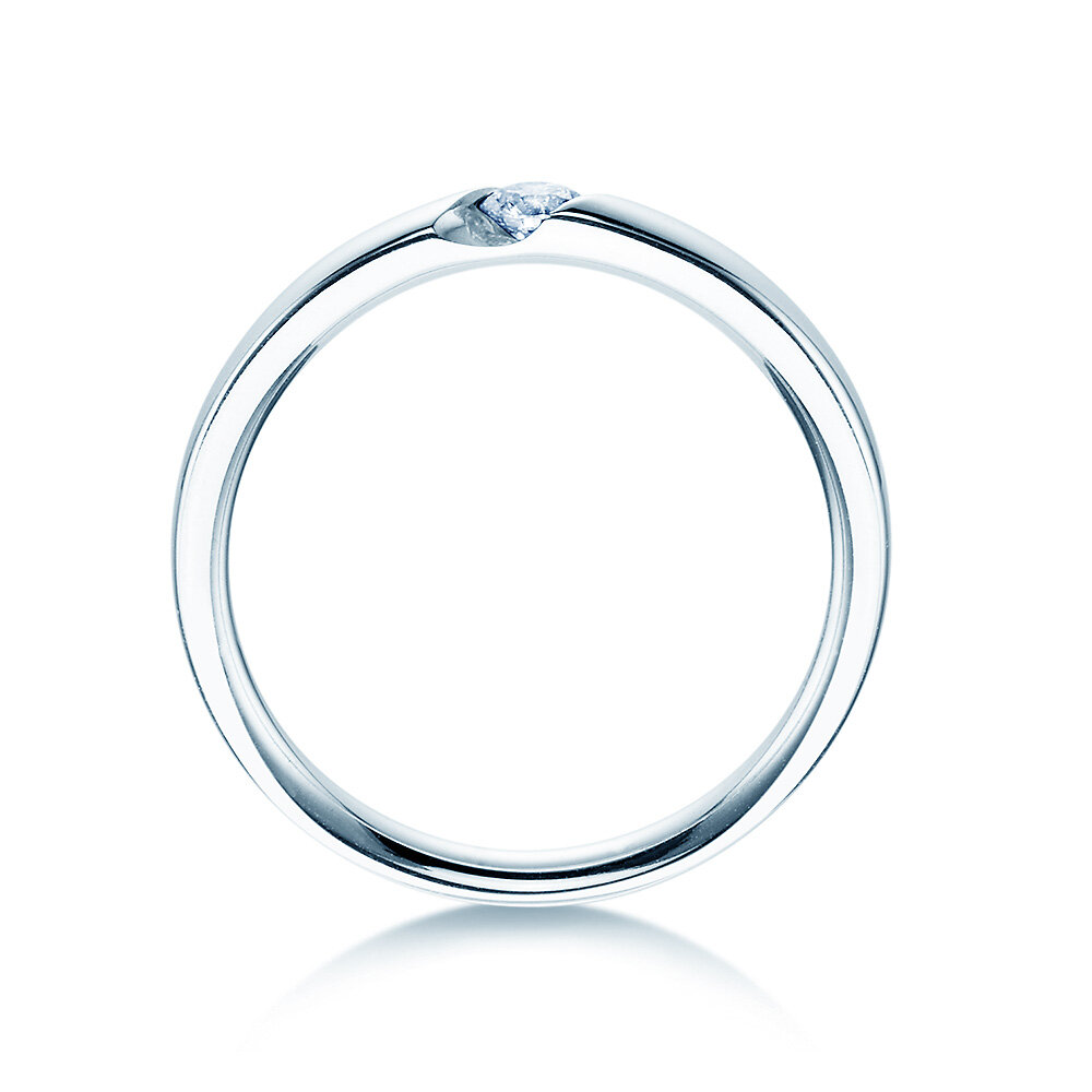Ein klassischer Spannring, schlicht und elegant. Auf den zweiten Blick offenbart sich seine besondere Raffinesse, die diagonal verlaufende Fassung. Sie gibt dem Diamanten sicheren Halt und sorgt, durch die offen ausgeformten Seiten, für seitlich einfallendes Licht. Der Diamanten beginnt zu strahlen.